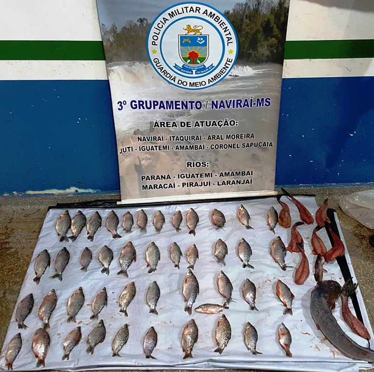 Campo Grande (MS) – Durante bloqueio na entrada da cidade, Policiais Militares Ambientais de Naviraí abordaram ontem (24) às 22h00, um veículo VW Voyage e, no porta-malas, encontraram 52 exemplares de peixes das espécies curimbatá e cascudo, pesando