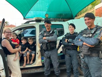 Coxim (MS) – A Polícia Militar participou, na tarde de hoje (18/03), de um momento especial na vida do Pequeno Adam, que comemorou seus 2 anos de idade cercado de alegria e emoção em Coxim. A solicitação partiu da mãe do menino, que relatou a