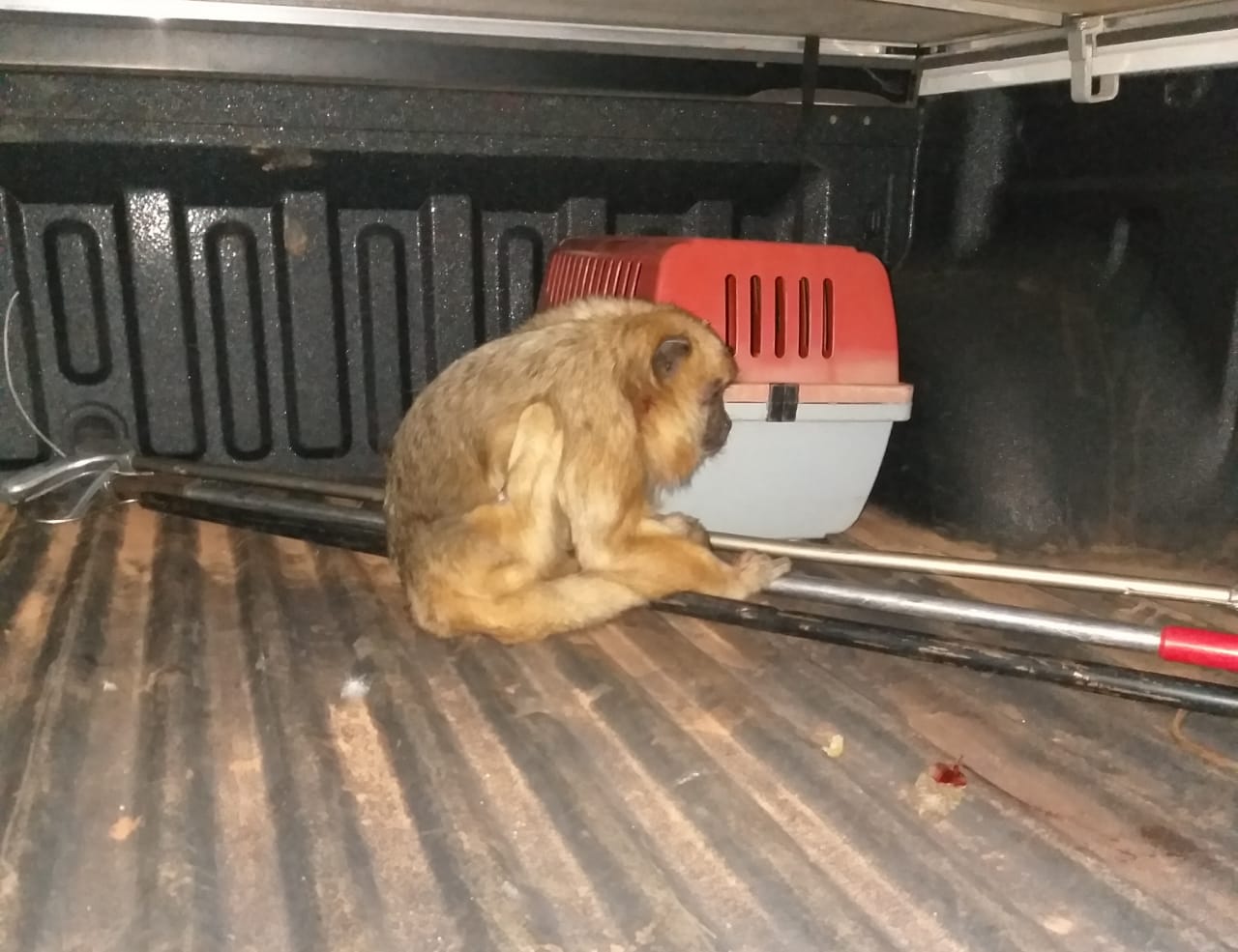 Campo Grande (MS) – Policiais Militares Ambientais de Campo Grande resgataram hoje (26) à tarde um animal da espécie Alouatta seniculus (bugio) vítima de atropelamento no Parque dos Poderes. A PMA capturou o animal nas proximidades de um posto de