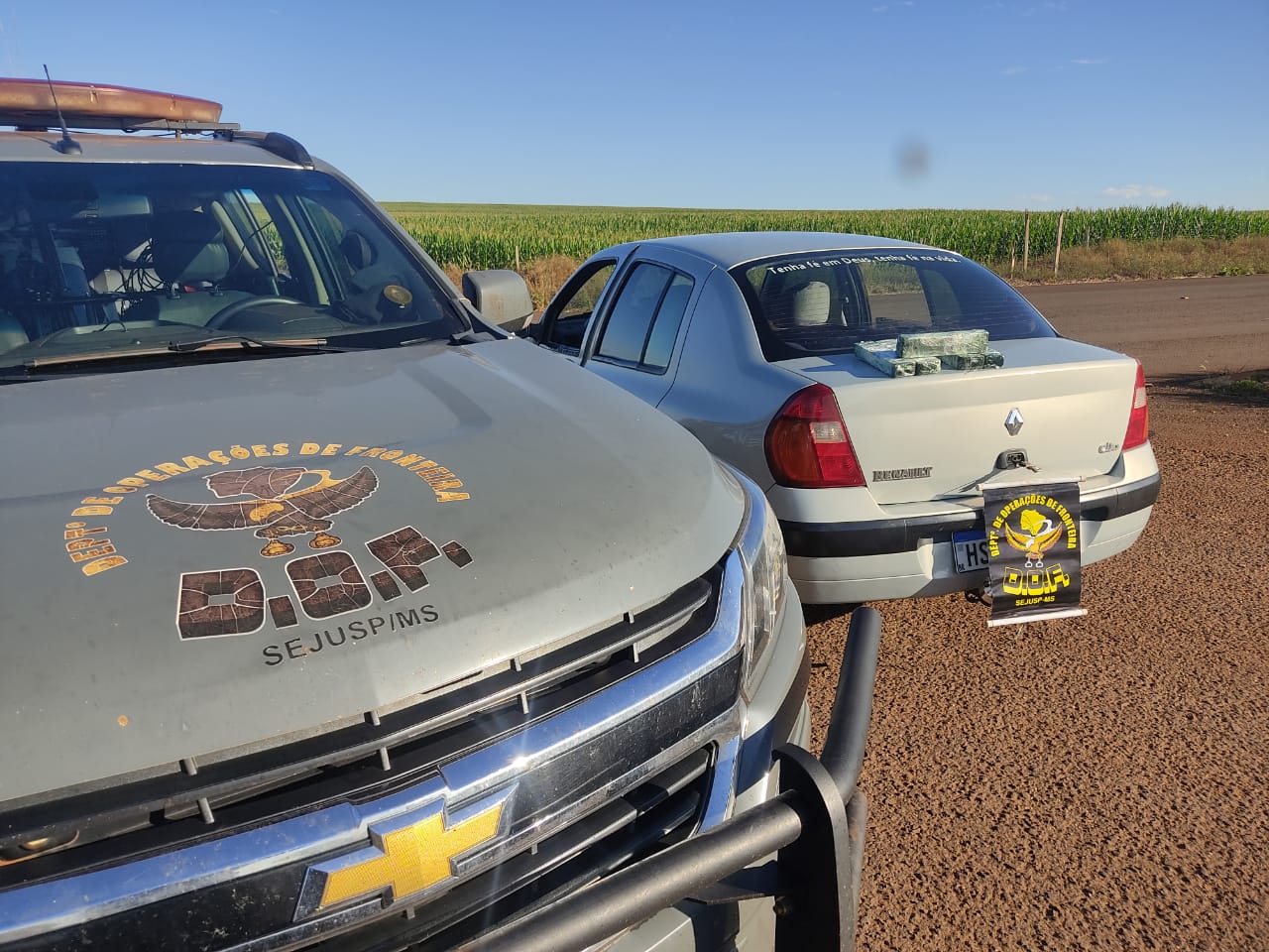 Maracaju (MS), 16 de maio – Policiais do Departamento de Operações de Fronteira (DOF) apreenderam, na manhã de sábado, um veículo Renault Clio de cor prata carregado com 100 quilos de maconha. A ação ocorreu em virtude da Operação Hórus, parceria