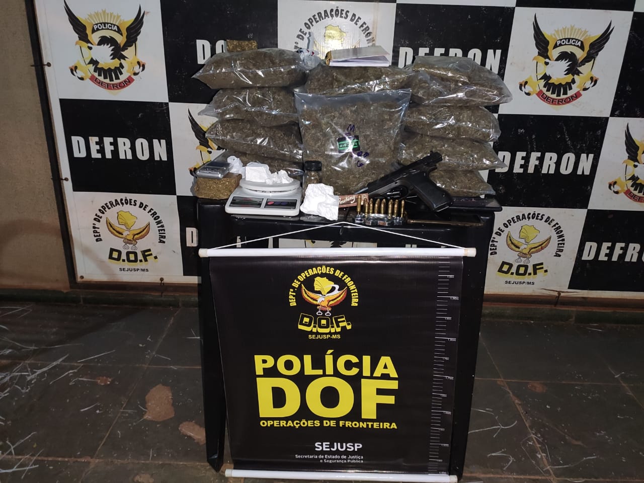 Dourados (MS), 27 de abril – Policiais do Departamento de Operações de Fronteira (DOF) prenderam, na noite de ontem, um homem de 27 anos de idade com uma pistola JERICHO de calibre 9mm, com 25 munições do mesmo calibre, intactas mais 7 quilos de maconha