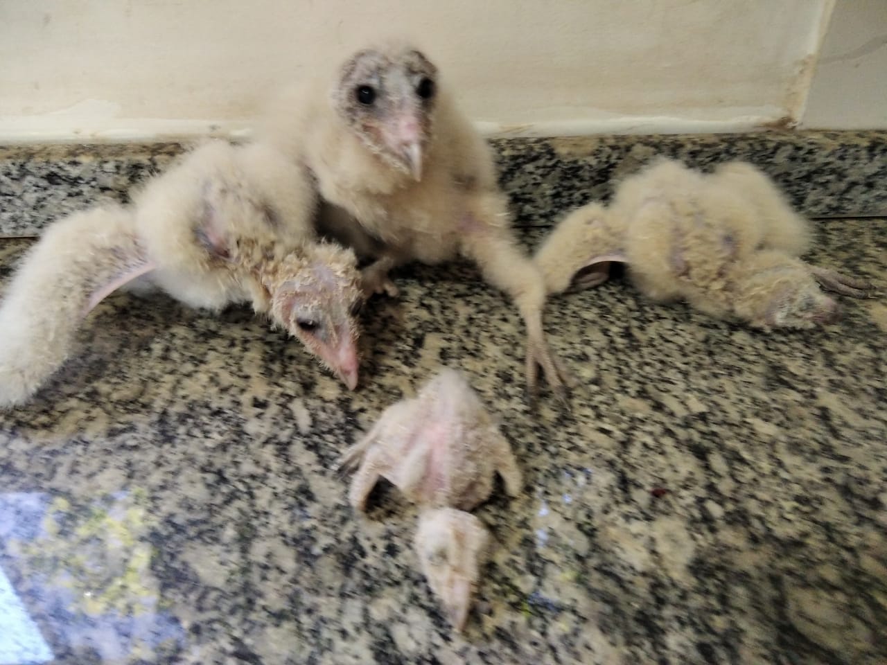 Campo Grande (MS) – Policiais Militares Ambientais de Dourados receberam hoje (22), quatro filhotes de animal silvestre da espécie conhecida como coruja suindara (Tyto furcata), resgatados em uma residência em reforma naquela cidade. O proprietário