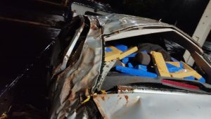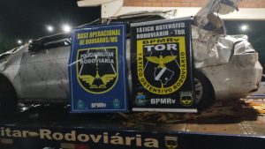 O veículo era conduzido por um homem de 29 anos, que de imediato informou aos policiais que apenas estava transportando mercadorias oriundas do Paraguai-PY. Nesse momento a equipe ouviu vozes provenientes de rádio comunicador, nas quais os interlocutores perguntavam se “estava tudo tranquilo” e se não havia presença de viaturas policiais na região, indicando que as perguntas eram realizadas pelos ocupantes do veículo que seguiam à frente. Diante do fato a equipe decidiu acompanhar os demais veículos para realizar a abordagem, momento em que o condutor do veículo VW Novo Voyage, percebendo que seria alcançado, acelerou ainda mais a sua velocidade, perdendo o controle direcional do veículo devido ao cascalho solto na pista, vindo a capotar a margem esquerda da via em uma plantação de milho.