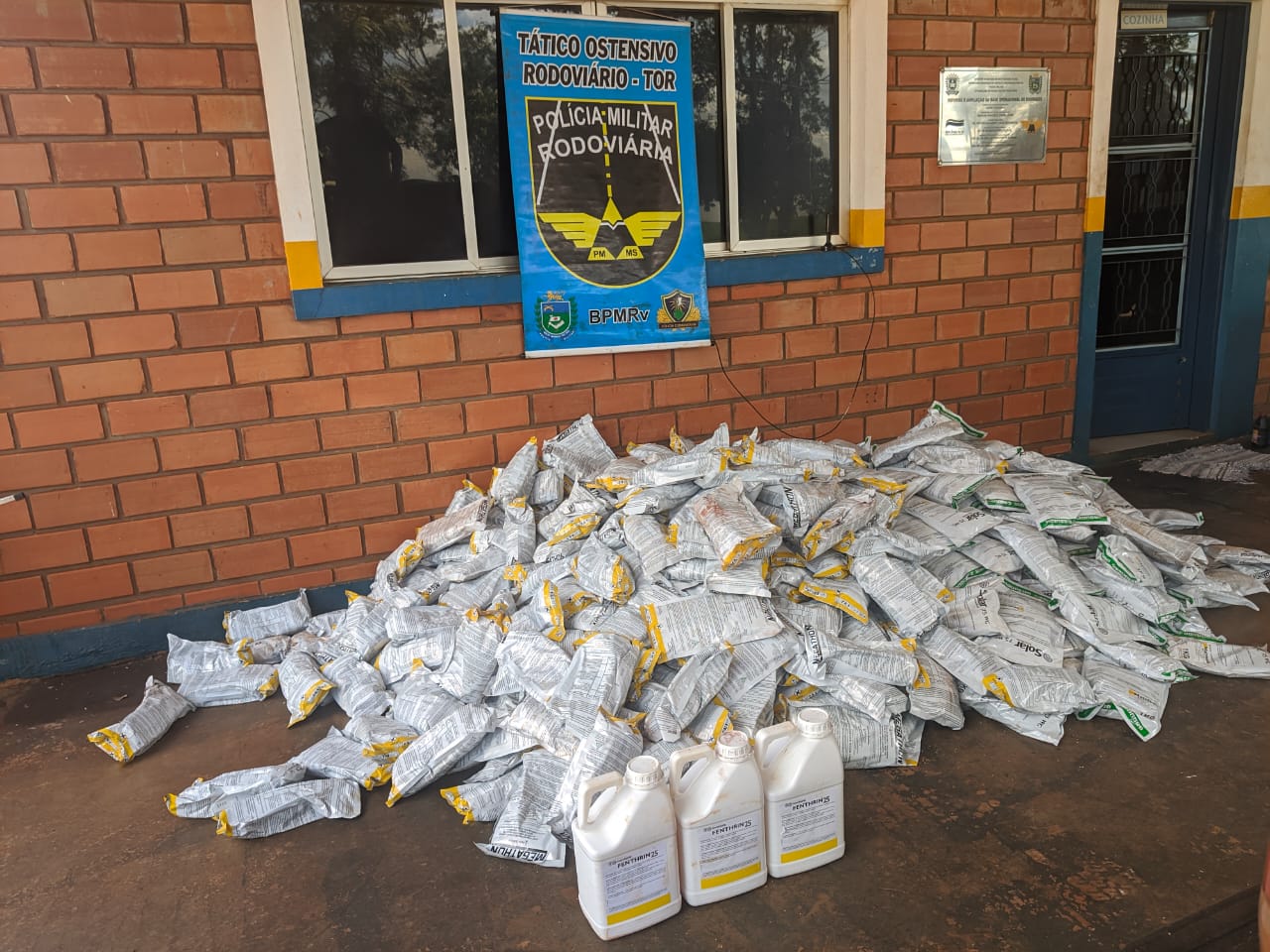 Dourados (MS) – Durante a Operação Hórus, desencadeada pela SEJUSP/MS e pela Secretaria Nacional de Operações Integradas (SEOPI) do Ministério de Justiça e Segurança Pública, a Polícia Militar Rodoviária apreendeu na tarde desta segunda-feira (13), em Dourados – MS, 548 kg de agrotóxicos e mais 300 litros do produto, além de prender um homem de 38 anos realizando o serviço de “batedor”.