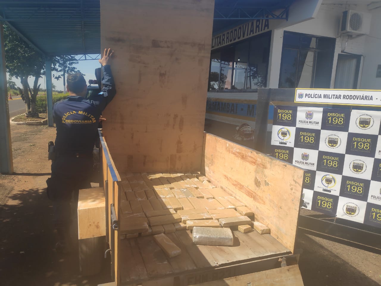 Amambai (MS) — Durante a Operação Hórus, desencadeada pela SEJUSP/MS e pela Secretaria Nacional de Operações Integradas (SEOPI) do Ministério de Justiça e Segurança Pública, na manhã desta quarta-feira (11) em Amambai – MS, a Polícia Militar Rodoviária localizou 116 kg de maconha escondida em fundo falso de uma carretinha reboque.