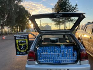 Em vistoria no interior do veículo, foram encontrados cerca de 500 pacotes de cigarros de origem estrangeira de marcas diversas. Apesar das diligências, o condutor do veículo não foi localizado.
