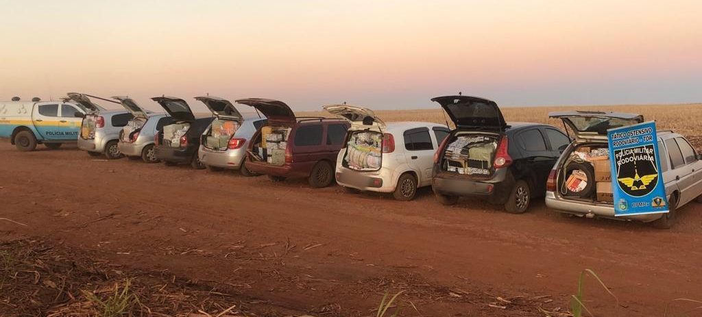 Nova Alvorada do Sul (MS) — Na tarde de ontem (23), na estrada vicinal do Clube do Laço de Nova Alvorada do Sul, rota alternativa para prática de delitos transfronteiriços, a Polícia Militar Rodoviária (PMR) apreendeu oito veículos lotados com