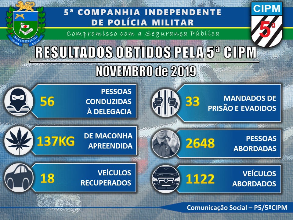 Campo Grande (MS) – A 5ª Companhia Independente de Polícia Militar, responsável pelo policiamento na Região Urbana do Imbirussu, encerrou o mês de novembro com 137 Kg de maconha apreendidos, além da captura de 33 pessoas que estavam a pedido da