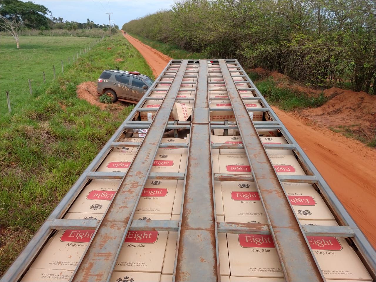 Itaquiraí (MS), 13 de novembro – Policiais do Departamento de Operações de Fronteira (DOF) apreenderam, na manhã desta quarta-feira, um caminhão Mercedes-Benz de cor azul, com placas de Ponta Porã (SP), carregado com 35 mil pacotes de cigarros