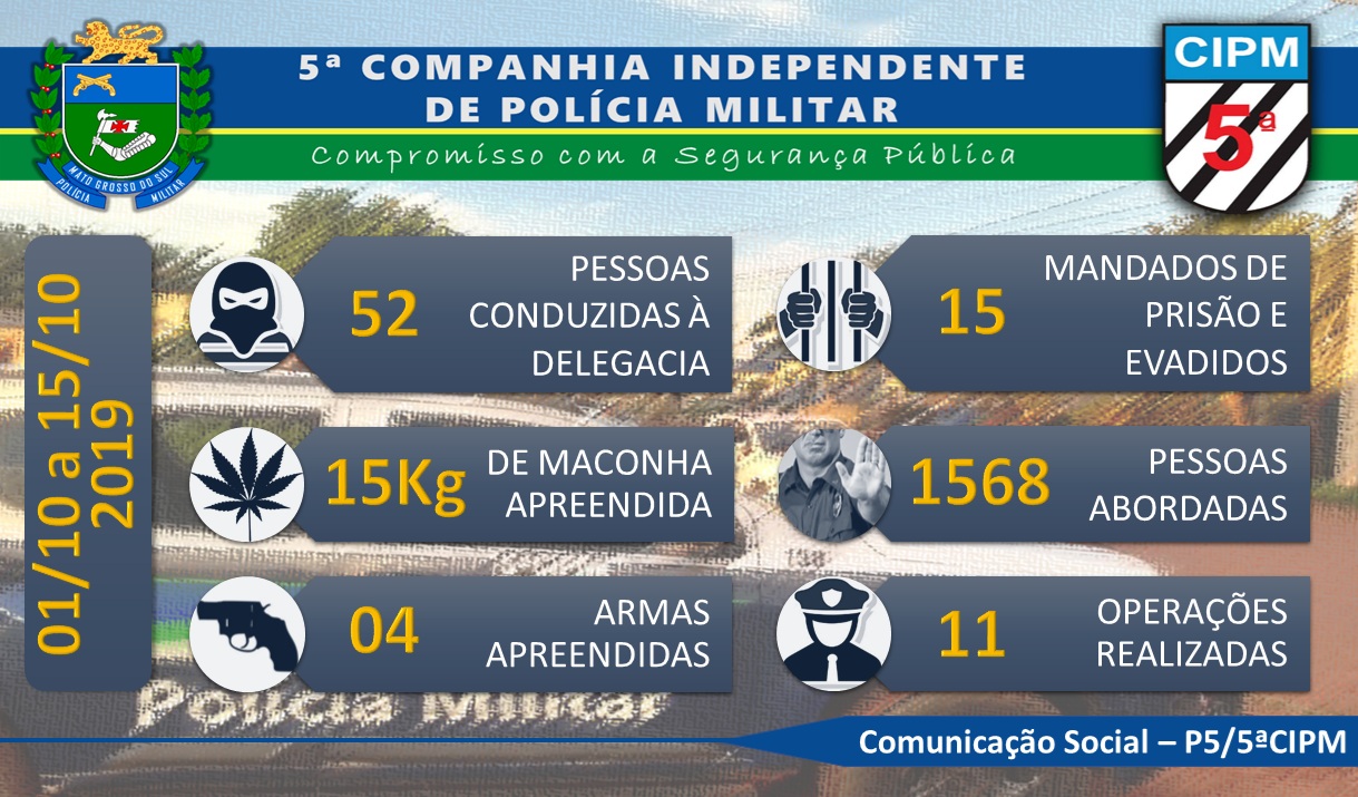 Campo Grande (MS) – A 5ª Companhia Independente de Polícia Militar, responsável pelo policiamento na região urbana do Imbirussu, concluiu a primeira quinzena de outubro com uma média de mais de 01 cumprimento de Mandado de Prisão por dia. Durante
