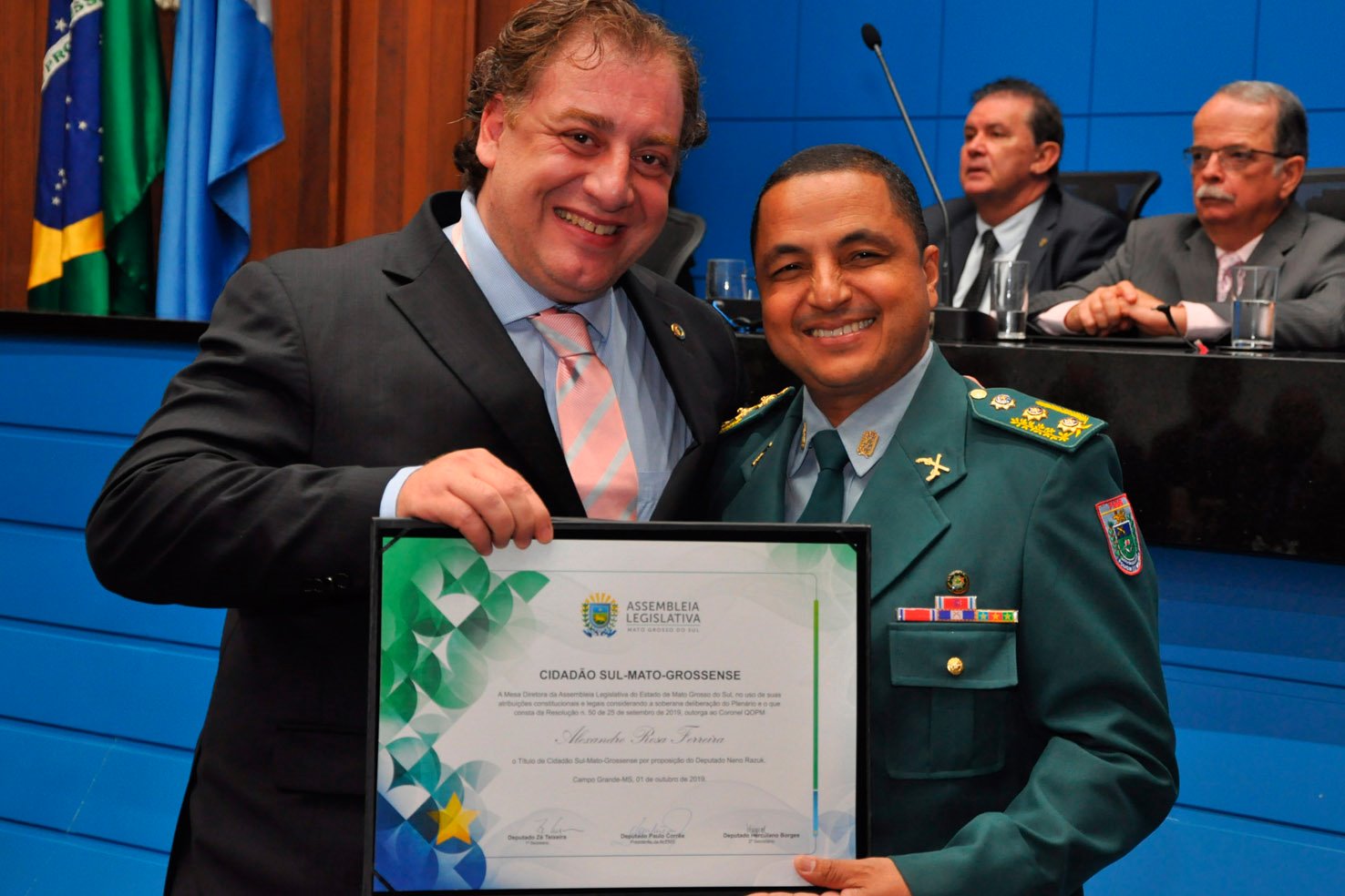 Campo Grande(MS) – Na data de ontem(01/10), o Chefe do Estado-Maior-Geral da PMMS, Coronel PM Alexandre Rosa Ferreira, recebeu o título de cidadão sul-mato-grossense, o evento foi promovido pela pela Assembléia Legislativa na capital de Mato Grosso