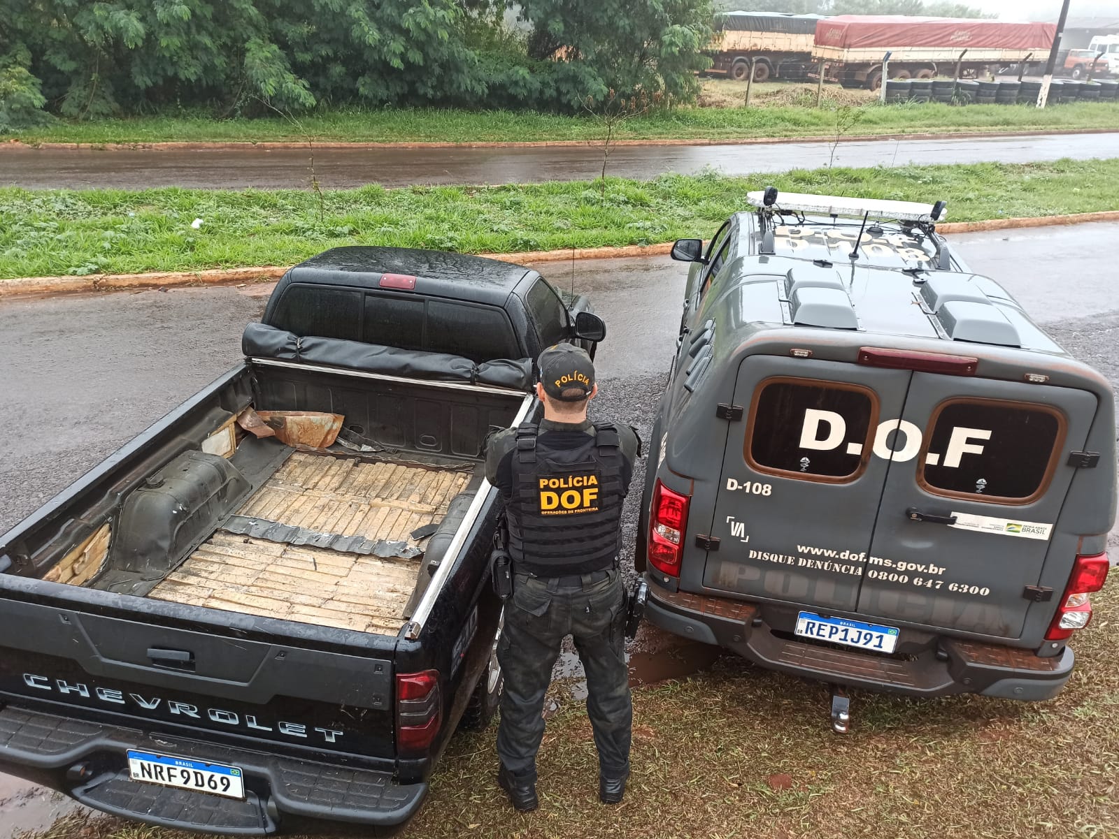 O DOF (Deparmento de Operações de Fronteira) apreendeu nesta segunda-feira (30/05), na MS-386, zona rural de Ponta Porã, uma caminhoneta GM/S10 carregada com maconha e cacaína. As drogas eram transportadas em um fundo falso na careceria do veículo. Um