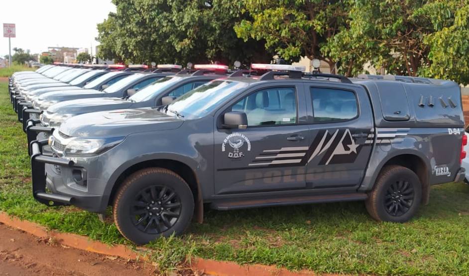 Dourados (MS), 4 de março – O Departamento de Operações de Fronteira (DOF) recebeu, nesta quinta-feira (3), dezoito novas viaturas do modelo Chevrolet S10 LT DD4A, equipadas para atender às necessidades da atuação do DOF frente aos crimes