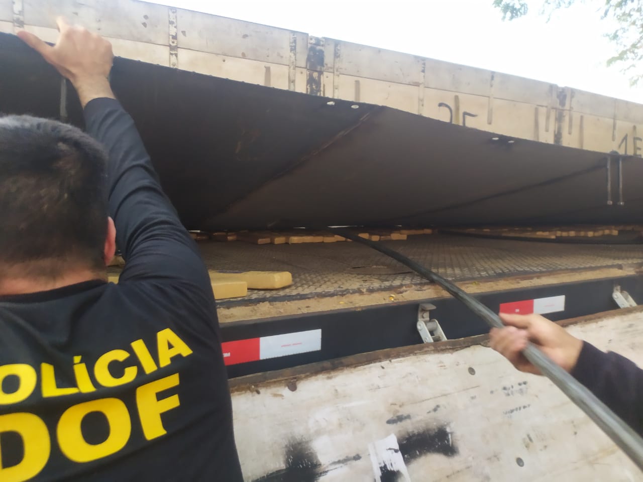 Amambai (MS), 25 de junho – Policiais do Departamento de Operações de Fronteira (DOF) apreenderam, na tarde desta sexta-feira, um cavalo trator Sinotruck branco acoplado a um semirreboque, com um fundo falso onde estavam os volumes prensados do