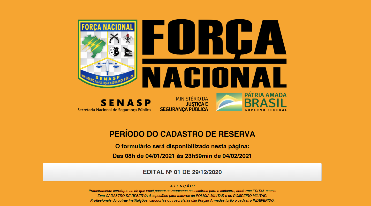 Campo Grande (MS) – A Força Nacional de Segurança Pública lançou dia 29/12, o processo seletivo para formação de cadastro de reserva e banco de dados de militares dos estados e do Distrito Federal que tenham passado para a inatividade há menos de