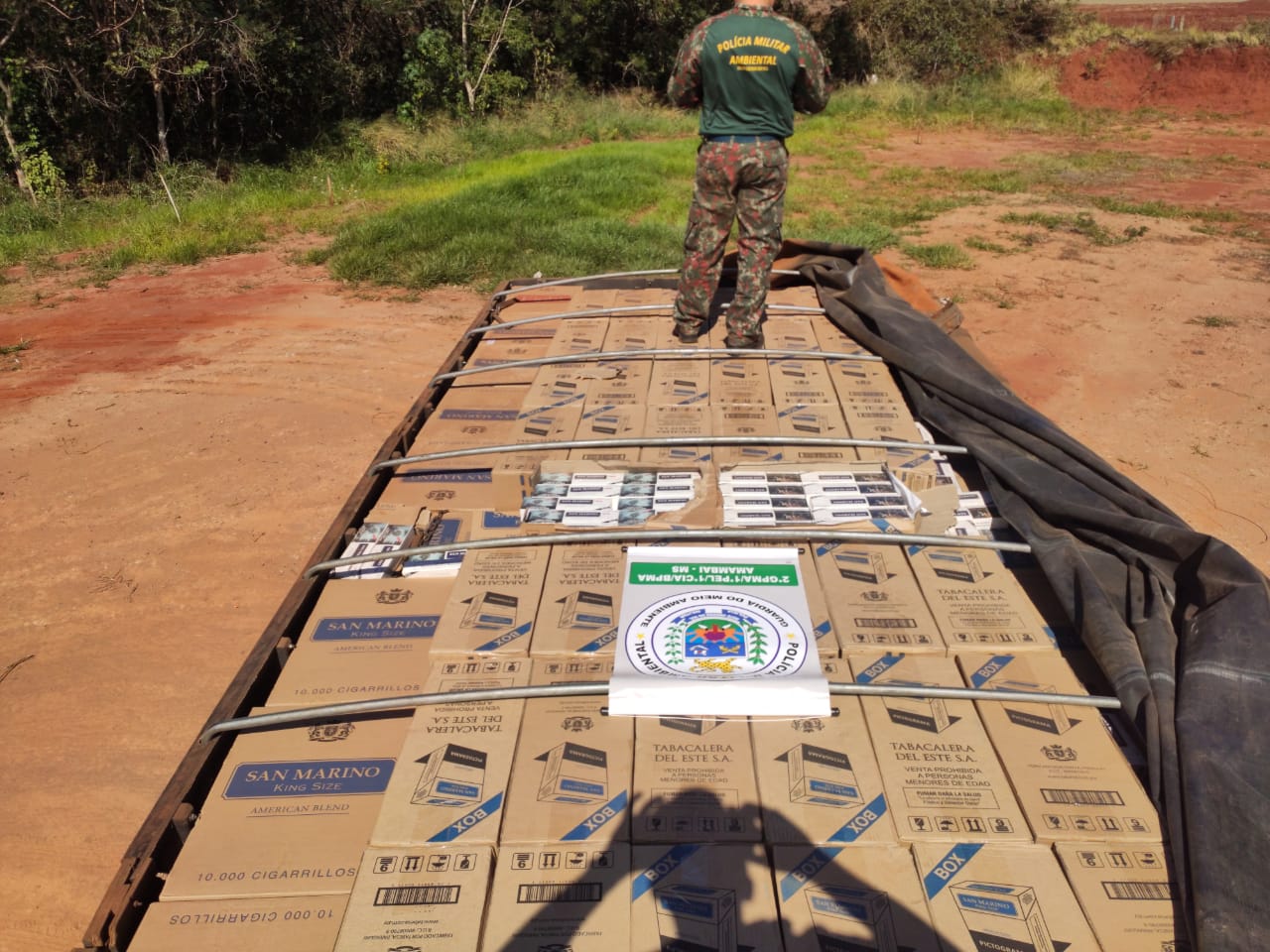 Campo Grande (MS) – Policiais Militares Ambientais de Amambai realizavam fiscalização na rodovia MS 156 hoje (7) no final da manhã e apreenderam um veículo Tractor marca Volvo com carreta bitrem acoplada, transportando cigarros contrabandeados do
