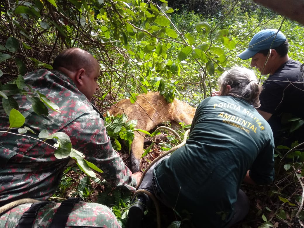 Captura de cervo-do-pantanal Campo Grande (MS) – Policiais Militares Ambientais de Miranda receberam uma solicitação de ajuda de pessoas para verificar a situação de um cervo-do-pantanal que estaria extremante debilitado e pela sua fragilidade