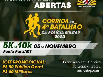 Ponta Porã (MS) – Em novembro, acontece em Ponta Porã a corrida promovida pelo 4º BPM (Batalhão de Polícia Militar), com premiações em dinheiro e troféus. A corrida será de 10km e 05km e é aberta para o público geral e militares. Serão