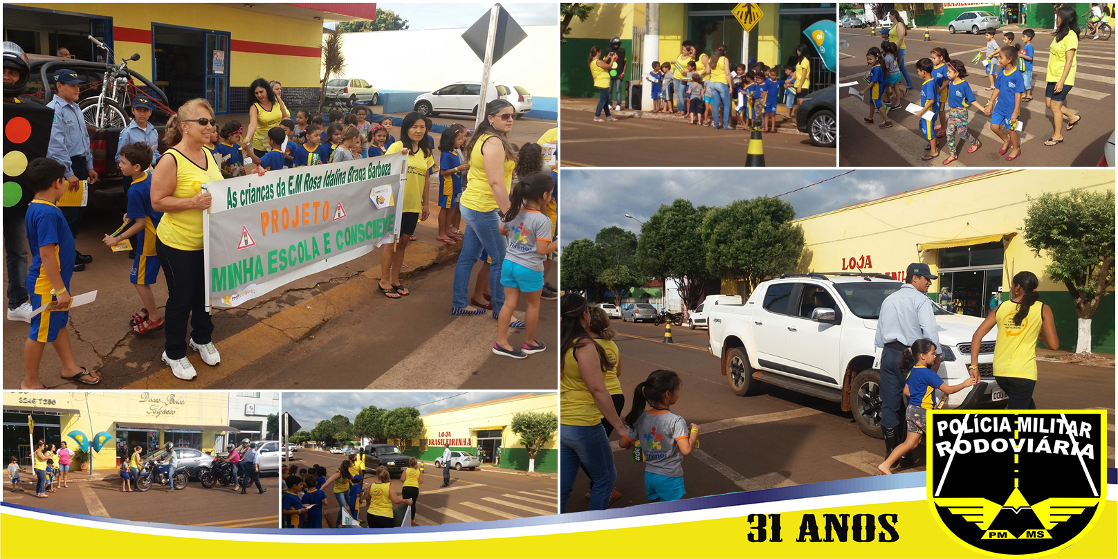 Campo Grande (MS) –Polícia Militar Rodoviária de Campo Grande, no dia 230/05, realiza panfletagem de conscientização aos condutores de Terenos com o projeto CEMATRAN e com a presença de crianças da Escola Municipal Rosa Idalina Braga Barboza Com seu